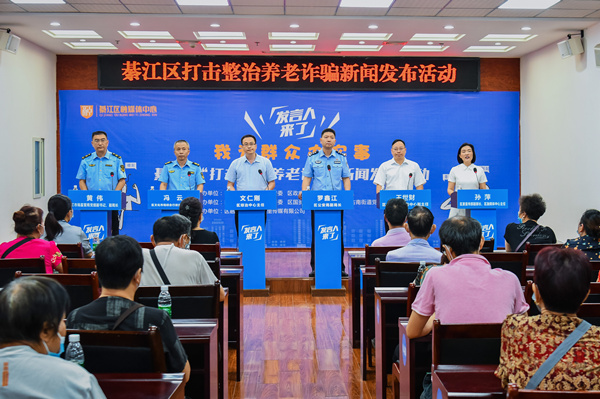 9月15日,“发言人来了——我为群众办实事”綦江区“打击整治养老诈骗”新闻发布活动在綦江古南街道文昌宫召开。来自重庆市綦江区综治中心、区公安局、区文化市场综合行政执法支队、区金融服务中心、区市场监管局5位新闻发言人发言并回答市民提问。