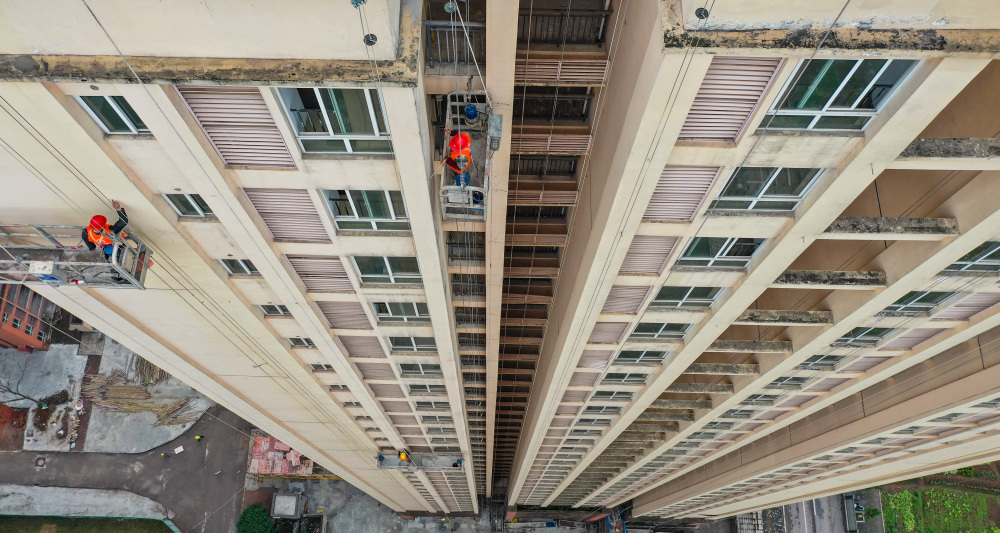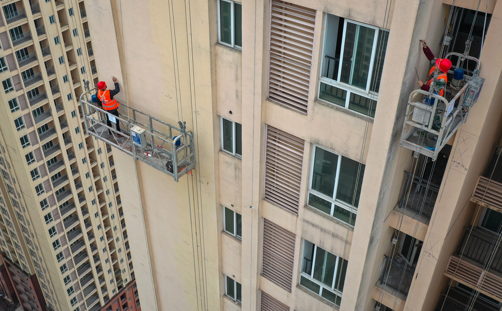 ▲2月22日,西部(重庆)科学城金凤佳园人才公寓,施工人员正在对外墙进行改造。首席记者 龙帆 摄/视觉重庆