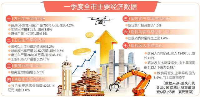 4月20日,市统计局、国家统计局重庆调查总队联合公布2026年度一季度我市经济发展数据,一季度全市实现地区生产总值7923.49亿元,同比增长4.5%。其中,第一产业实现增加值316.84亿元,同比增长3.8%;第二产业实现增加值2524.83亿元,同比增长3%;第三产业实现增加值5081.82亿元,同比增长5.3%。