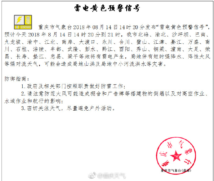 据@重庆天气 消息,重庆市气象台14时20分发布“雷电黄色预警信号”,预计今天14时20分到21时,北碚、渝北、沙坪坝、巴南、九龙坡、渝中、江北、南岸、大渡口、永川、合川、璧山、江津、綦江、万盛、南川、石柱、涪陵、丰都、武隆、彭水、黔江、酉阳、秀山、铜梁、潼南、大足、荣昌、长寿、垫江、忠县、梁平等地将有雷电产生,局地伴有短时强降水、阵性大风等强对流天气,可能会造成局地山洪及局地中小河流洪水等灾害。