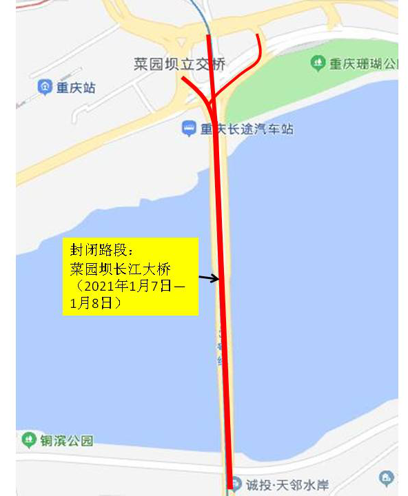 于2020年1月7日至8日(每日0时至6时)封闭菜园坝长江大桥及进入该桥的各匝道口,禁止车辆通行。