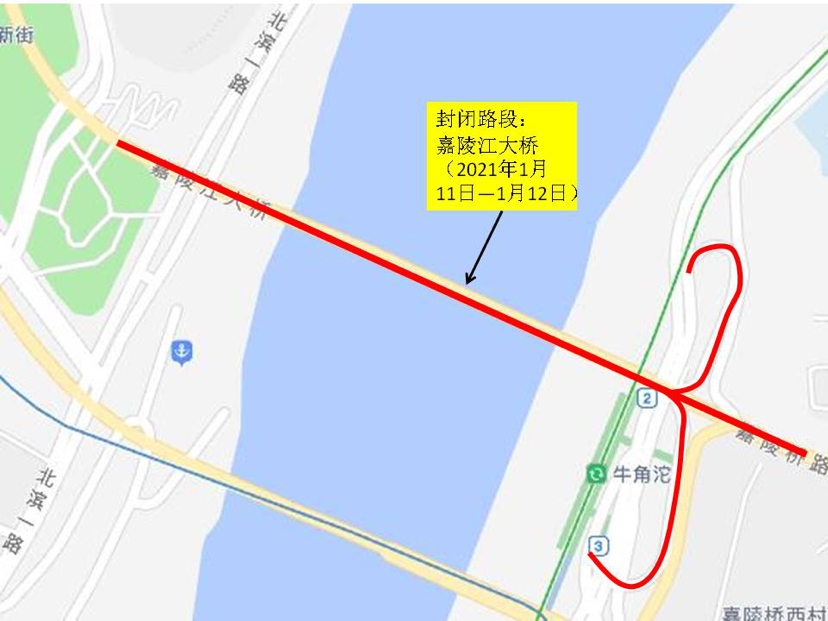 于2021年1月11日至12日(每日0时至6时)封闭嘉陵江大桥及进入该桥的各匝道口,禁止车辆通行。