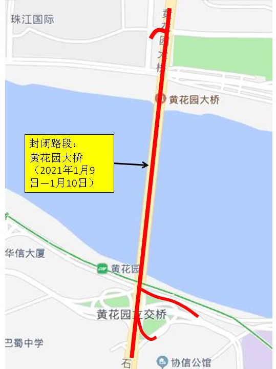 于2021年1月9日至10日(每日0时至6时)封闭黄花园大桥、大湾车站及北滨路上桥处、黄花园立交C匝道(大溪沟往江北方向)、D匝道(一号桥往江北方向)以及石黄隧道往江北方向,禁止车辆通行。