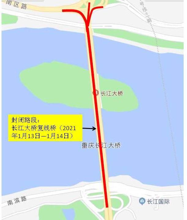 于2021年1月13日至14日(每日0时至6时)封闭长江大桥复线桥、中兴路、南区路、及石黄隧道进入长江复线桥的各匝道口,禁止车辆通行。