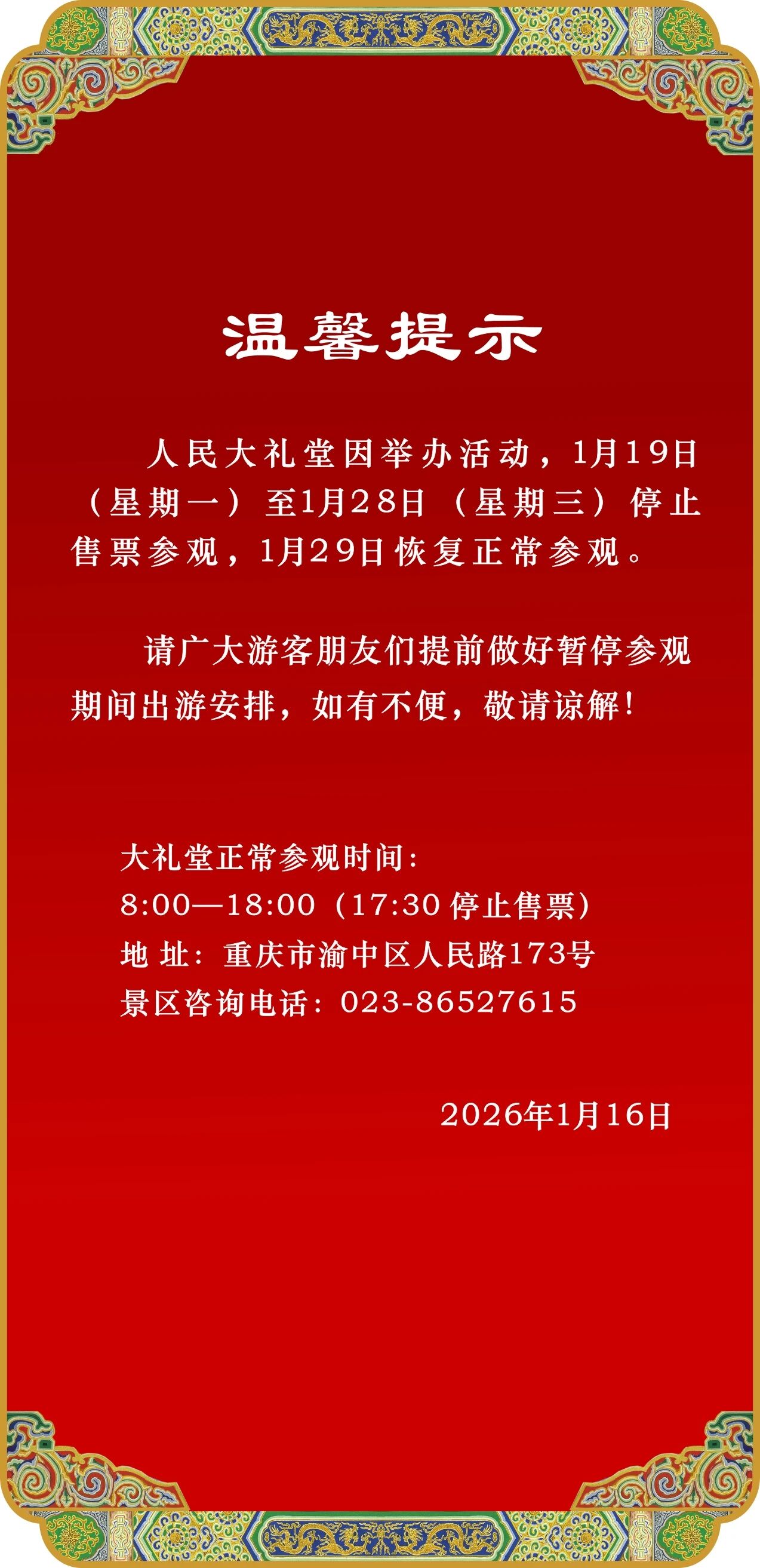 注意!1月19日人民大礼堂开放时间有变化