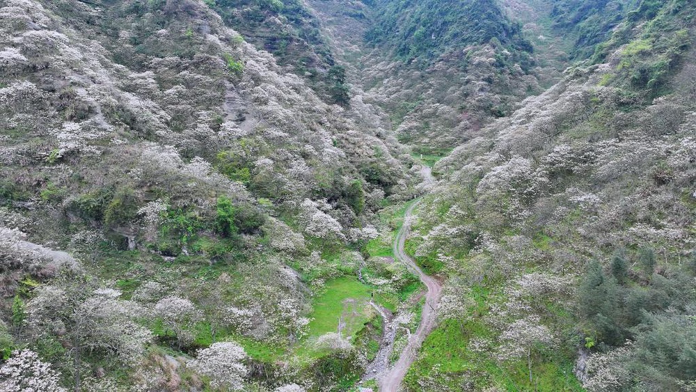 在可大乡可大村桐花岭,万亩桐花正值盛放期。小喇叭状的单层五瓣花挂满枝头,五六朵依偎成一簇,红色的花蕊点缀着洁白花瓣,花香含蓄而悠远。从空中俯瞰,连绵起伏的山峦被油桐花装点成一片片白色花海,犹如铺上一层薄雪,整个山峰仿佛进入浪漫的童话世界。
