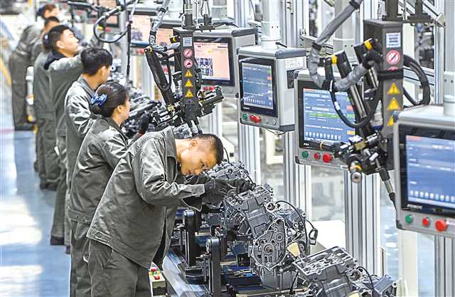 隆鑫通用C区工厂,工人正在生产线上组装KE500发动机。首席记者 龙帆 摄/视觉重庆