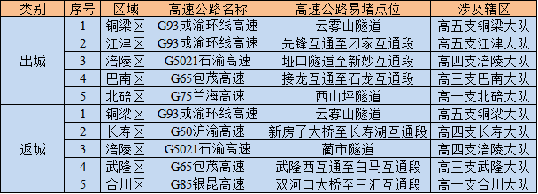返城易堵时段主要集中在6月24日15时至19时。期间,除上述易堵收费站外,G65包茂武隆西互通至白马互通段、接龙互通至石龙互通段,G93成渝环线云雾山隧道,G75兰海西山坪隧道等高速公路主线及隧道也将迎来大流量集中出行,详见下表: