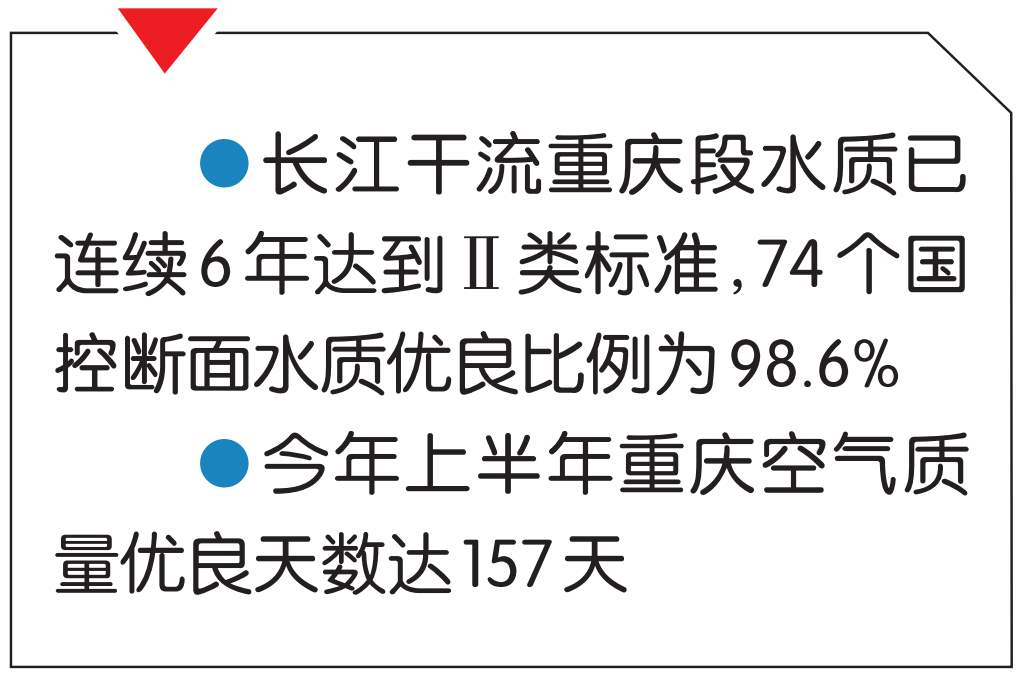 长江干流重庆段水质已连续6年达到Ⅱ类标准,74个国控断面水质优良比例为98.6%;今年上半年重庆空气质量优良天数达157天;全市土壤、声、辐射等环境质量保持稳定。