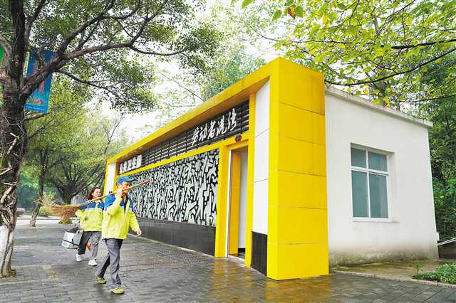 记者在沙坪坝区高滩岩湿地公园内见到一座“劳动者港湾”,这里环境清幽,给户外劳动者提供了一个闹中取静的休憩地。