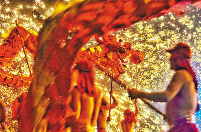 铜梁区七彩梦园,“龙乡”人民舞动火龙,在绚丽夺目的铁水“流星”中,欢度元宵佳节。记者 崔力 摄