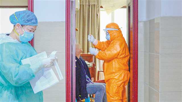 2月14日,在位于歌乐山的一集中隔离医学观察点,沙坪坝区疾控中心的检测人员正在为这里的留观人员进行新冠核酸检测采样。