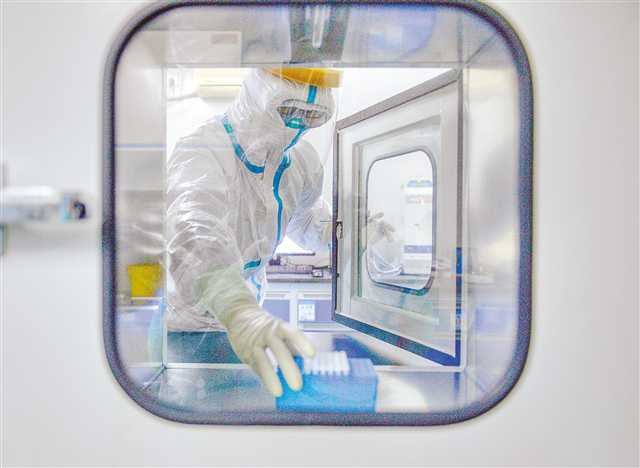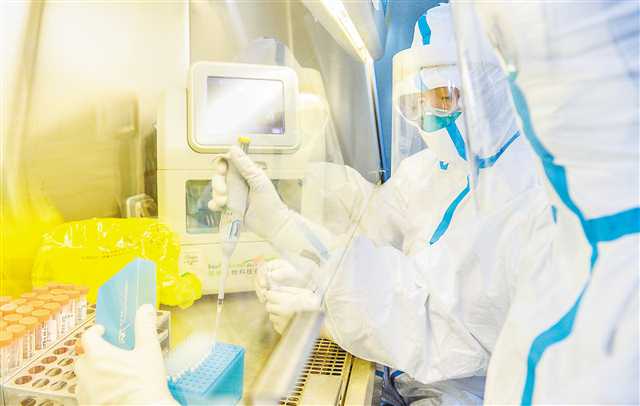 2月16日,在沙坪坝区疾控中心二级生物实验室体系配置室,检测人员肖小月正在生物安全柜里混合样品核酸和反应液,并将其放入扩增管。