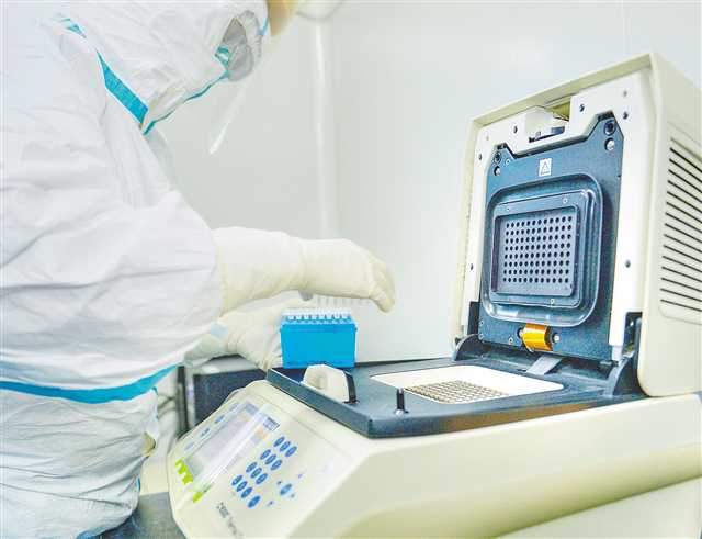 2月16日,在沙坪坝区疾控中心二级生物实验室核酸扩增室,检测人员肖小月将扩增管放入核酸检测仪,进行数据设置后,约两个小时输出结果。