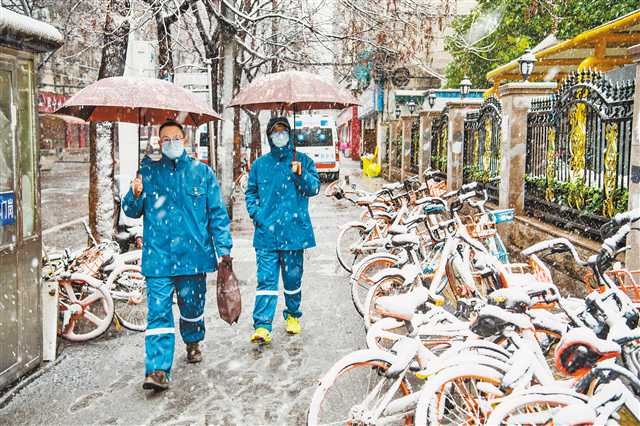 图③:重庆市第八批支援湖北医疗队医生走在积起冰渣的路面抵达医院外,准备进入病区。重报集团武汉报道组 谢智强 摄