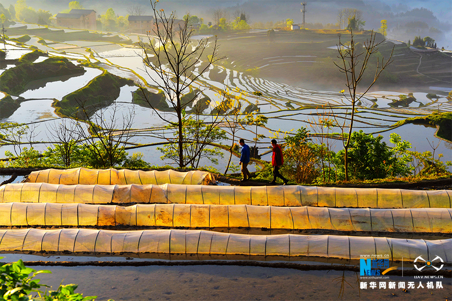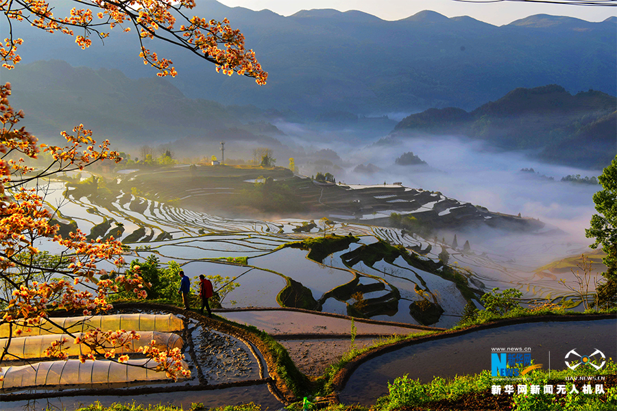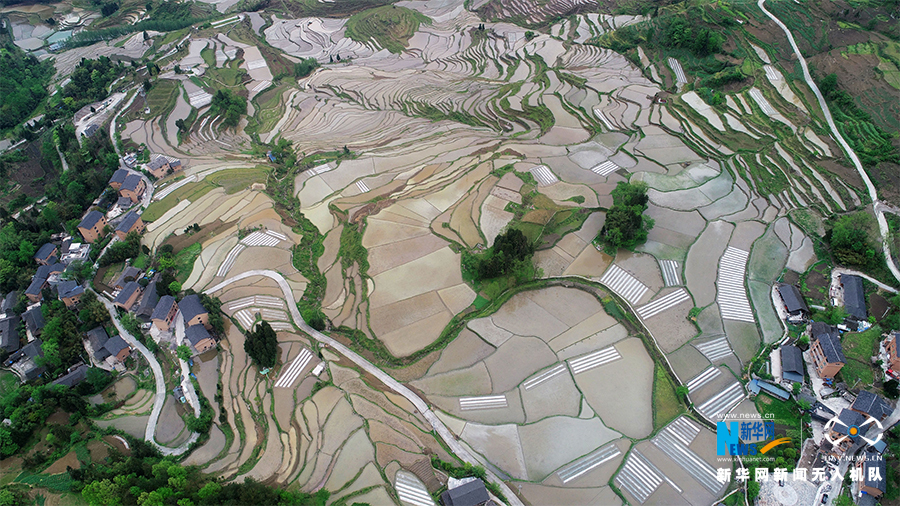 谷雨过后,酉阳县花田乡梯田蓄水充盈,层层叠叠,构成一幅醉人画卷。新华网发(陈碧生 摄)