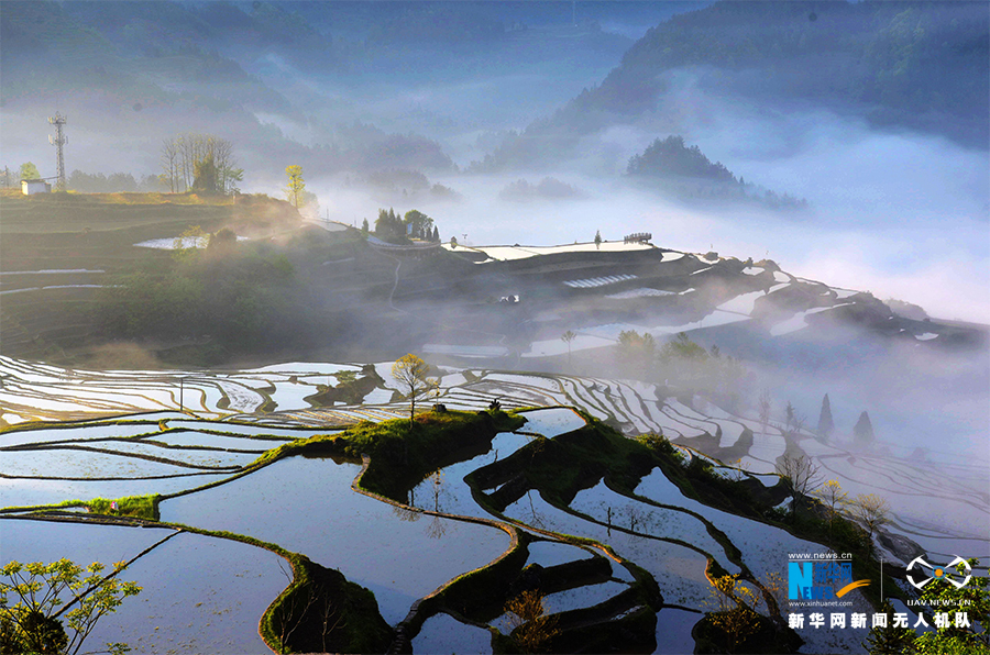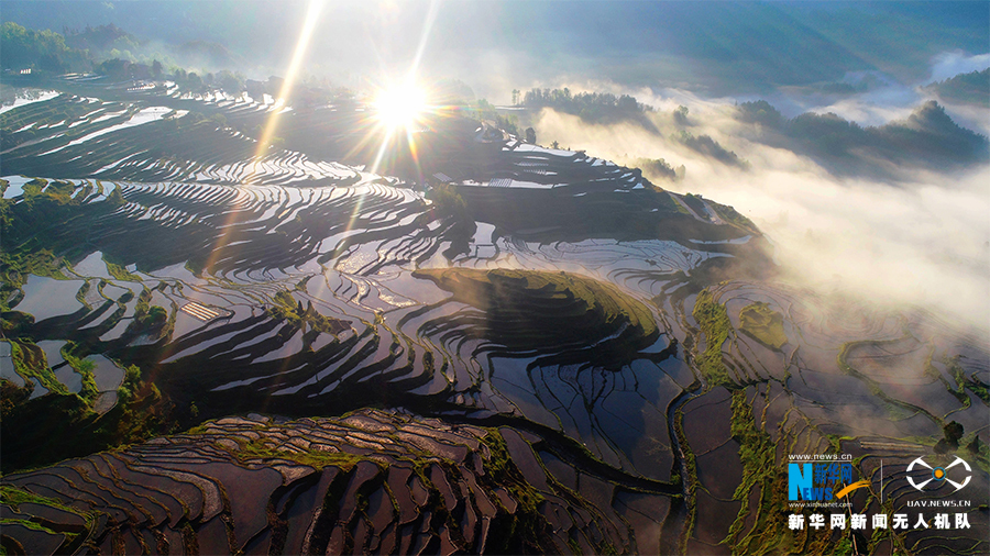 万亩梯田一鉴开,天光云影共徘徊。新华网发(陈碧生 摄)
