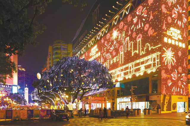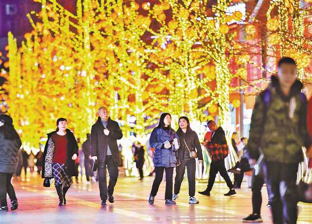 2月6日晚,杨家坪商圈大红灯笼高挂,璀璨的灯饰吸引众多市民前来观赏。记者谢智强摄/视觉重庆