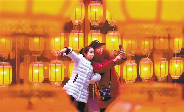 2月6日晚,黄桷桠老街,市民在一组灯笼前拍照留念。特约摄影钟志兵/视觉重庆