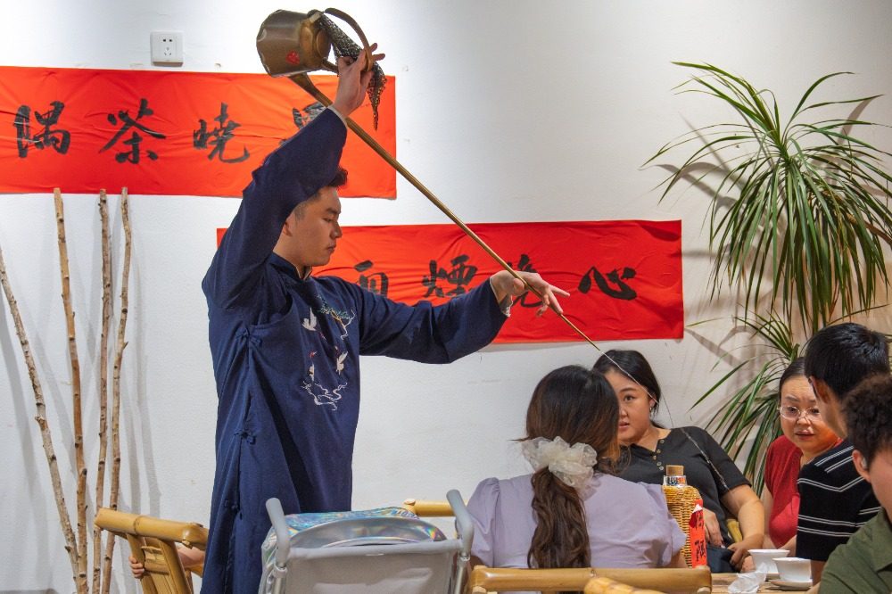 10月11日,渝中区十八梯传统风貌区,游客在观看长嘴壶茶艺表演。记者 李雨恒 摄