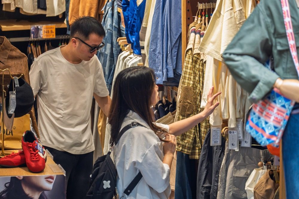 10月11日,渝中区十八梯传统风貌区,游客在选购服装。记者 李雨恒 摄