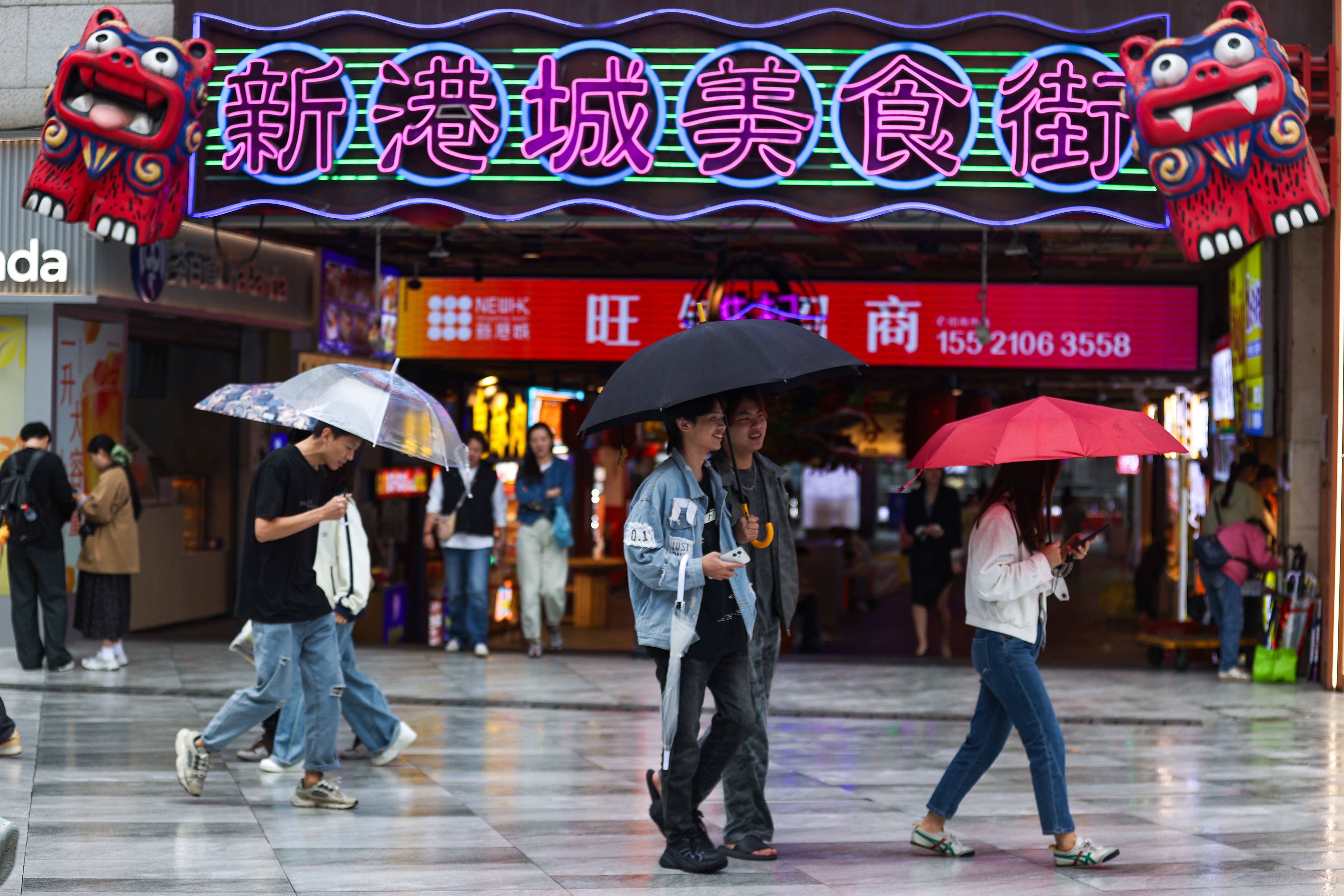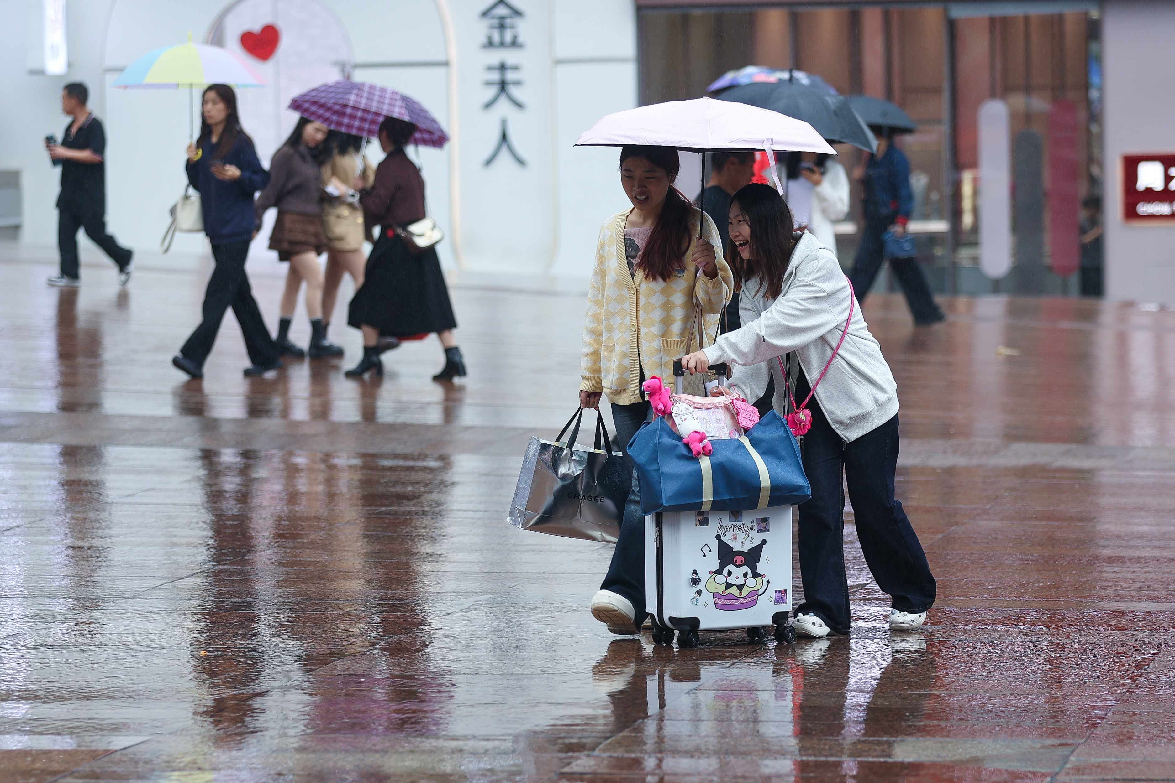 2025年10月20日,观音桥步行街,不少市民、游客添衣、打伞在雨中逛街。记者 尹诗语 摄