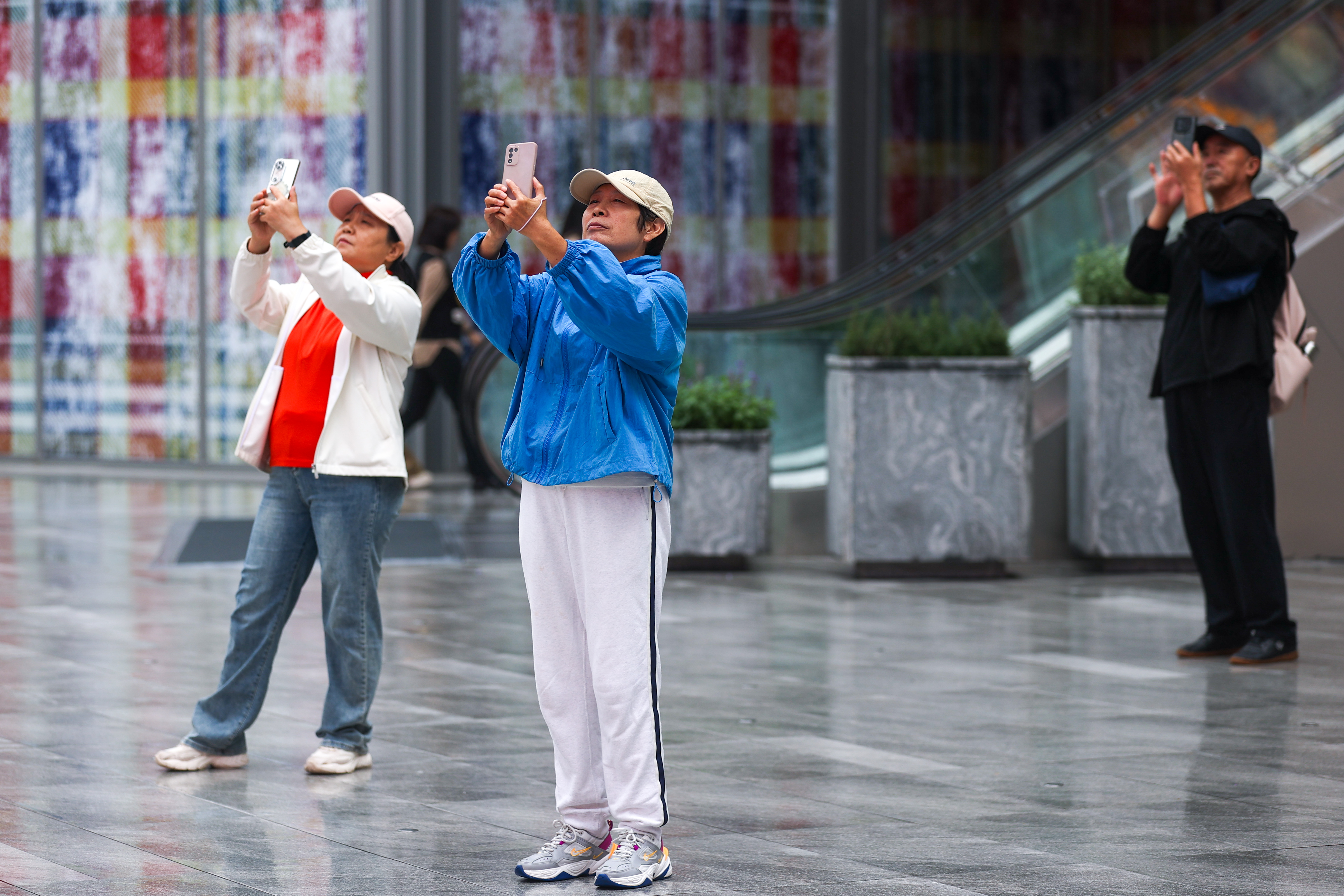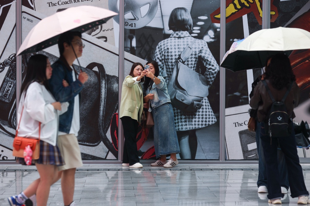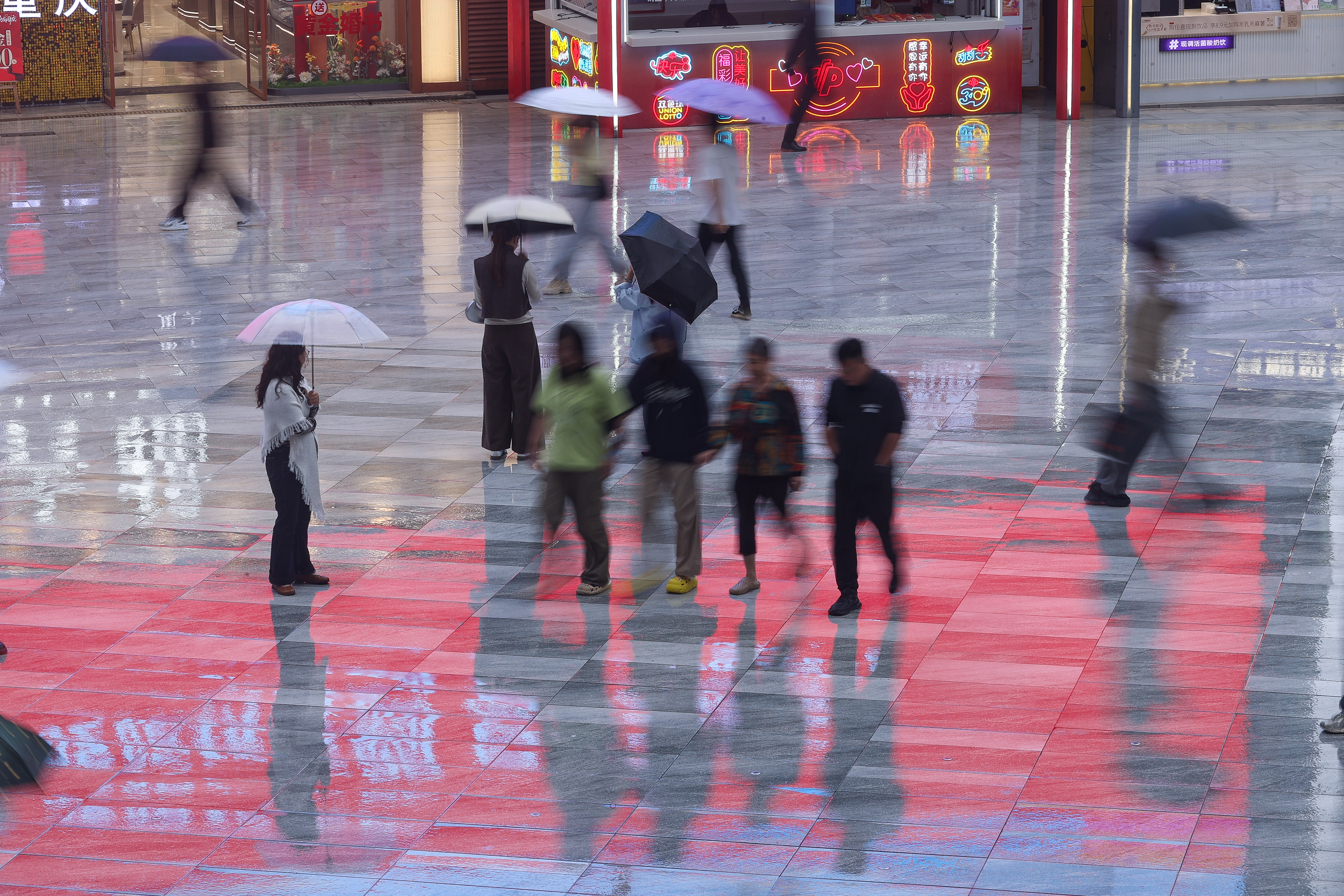 10月20日,观音桥步行街,不少游客正在雨中打卡观音桥步行街。