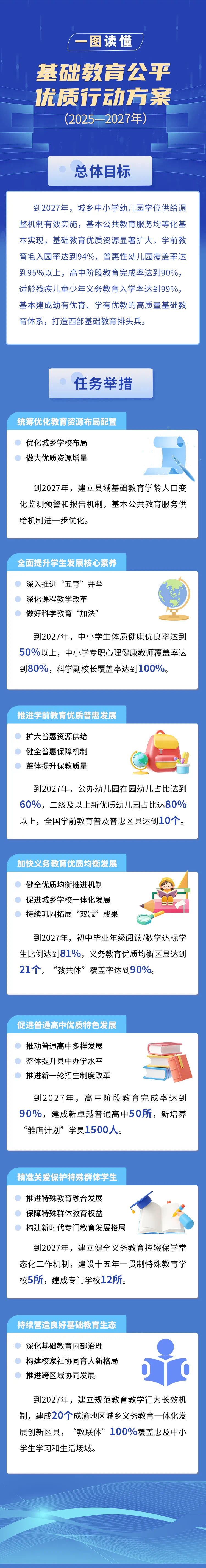 《行动方案》明确了总体目标,到2027年,城乡中小学幼儿园学位供给调整机制有效实施,基本公共教育服务均等化基本实现,基础教育优质资源显著扩大,学前教育毛入园率达到94%,普惠性幼儿园覆盖率达到95%以上,高中阶段教育完成率达到90%,适龄残疾儿童少年义务教育入学率达到99%,基本建成幼有优育、学有优教的高质量基础教育体系,打造西部基础教育排头兵。