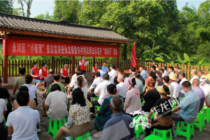 活动首日,在永川区仙龙镇双星村,来自仙龙镇12个村的100余名村民现场聆听第5小分队“小板凳”普法宣讲。