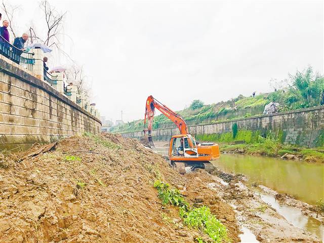 10月26日,万州区双河口街道,龙宝河河道里,一台挖掘机正在清理河道中的淤泥。