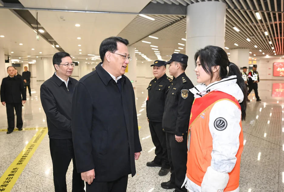 在重庆北站综合交通枢纽,袁家军、胡衡华走进指挥中心,认真听取全市春运保障情况汇报,仔细察看数字交通·数智节日驾驶舱运行状况,深入了解近期客流态势、中心城区公共交通运行、假期重大活动客流疏导预案等情况,看望慰问坚守一线的公安干警、铁路调度值班人员、综合行政执法和交通运输执法人员、大学生志愿者等,详细询问节日值班安排、主要工作职责,向大家致以新春问候。袁家军说,春节期间人流、车流、物流明显增加,坚守一线的工作人员十分辛苦,希望大家恪尽职守,持续提升运营、管理、服务水平,增强快速响应处置能力,有效保障群众安全出行、便捷出行。