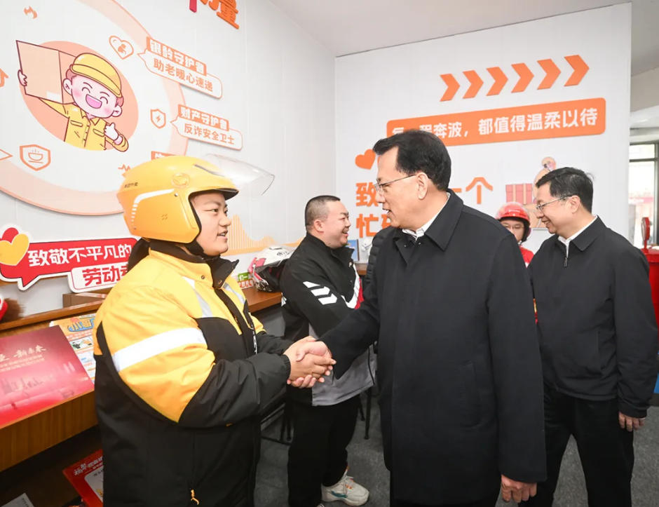 2月15日上午,在观音桥商圈“江心比新”驿站,市委书记袁家军,市委副书记、市长胡衡华看望慰问快递员、外卖骑手、网约车司机。记者 苏思 摄/视觉重庆