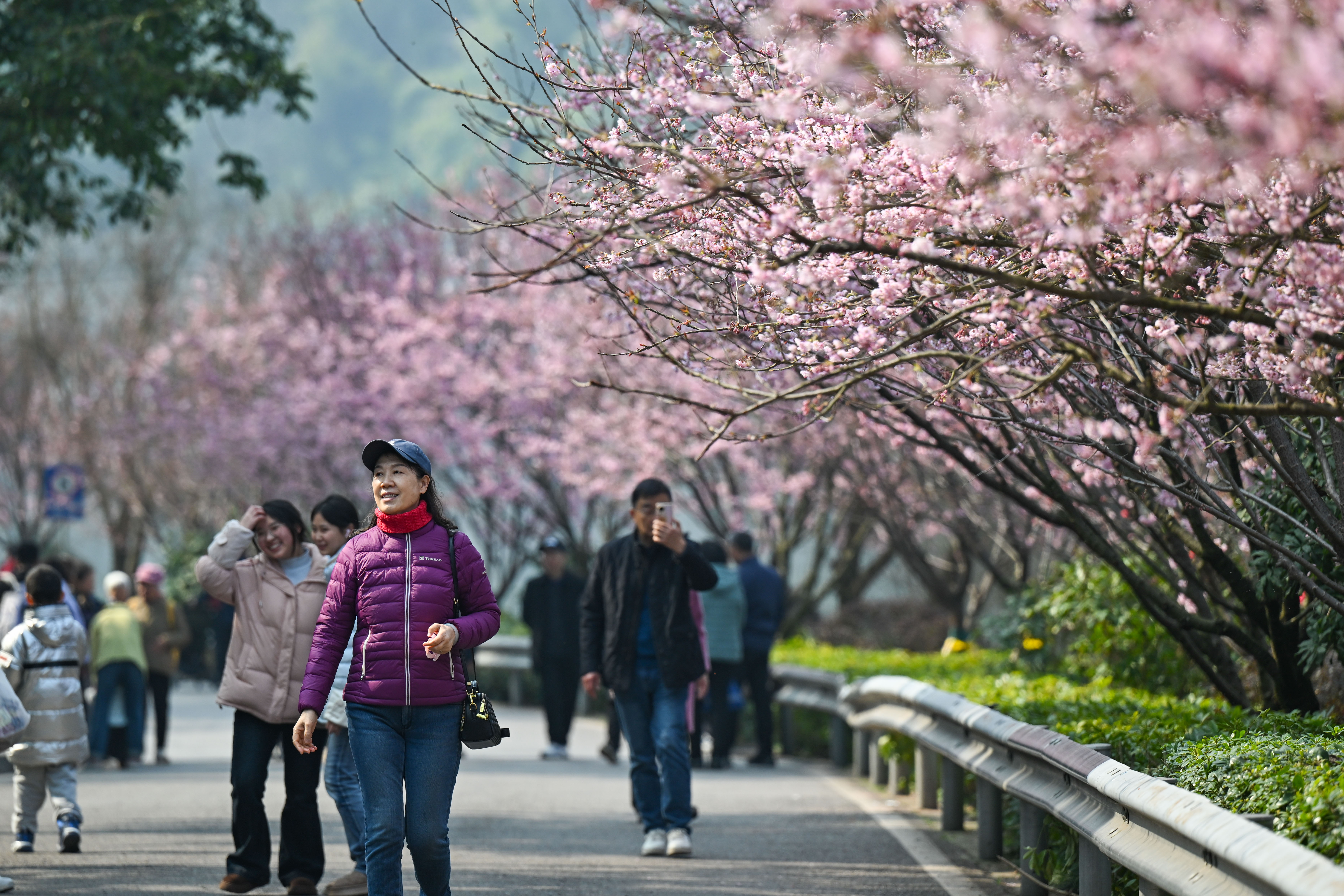 位于两江新区的重庆园博园内,樱花迎来最佳观赏期。图为市民、游客在盛开的椿寒樱花树下赏花。特约摄影 王加喜