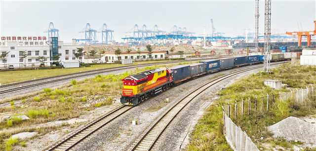 12月12日,一列西部陆海新通道铁海联运班列从广西钦州铁路集装箱中心站出发,驶向重庆团结村站,这是2023年西部陆海新通道铁海联运班列开行的第9000列。 (北部湾港集团供图)