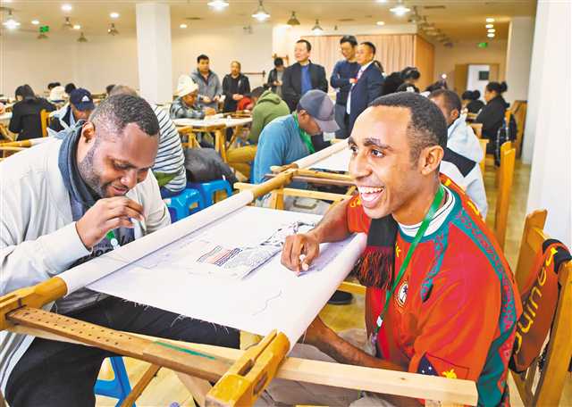 西部陆海新通道加速三峡刺绣登上国际舞台的步伐,图为12月6日,万州区三峡刺绣生产车间,巴布亚新几内亚的学生体验刺绣。特约摄影 冉孟军/视觉重庆