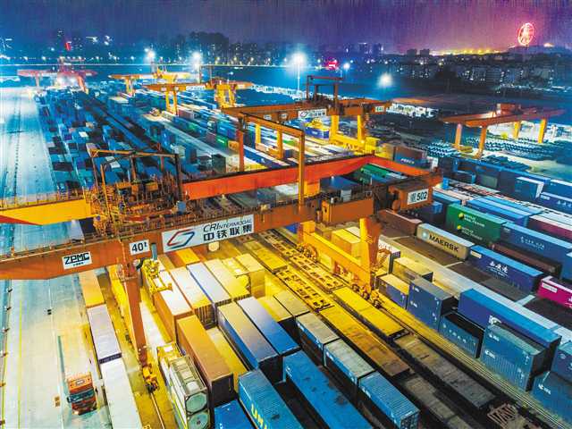 西部陆海新通道助力企业“走出去”,为通道沿线企业出海提供有力支撑。图为2月2日晚,位于沙坪坝区的重庆国际物流枢纽园区的夜间工作场景。特约摄影 孙凯芳/视觉重庆