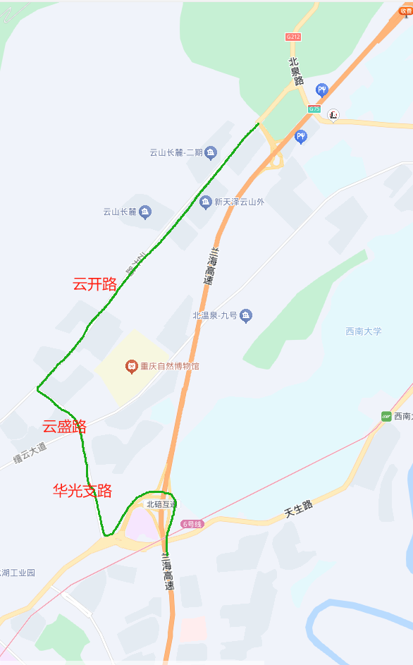 车辆从北环至北碚出城方向,可经以下线路分流:北环→北碚(双柏树)立交下道→双元大道(碚南大道)→华光支路→云盛路→云开路→缙云山立交。