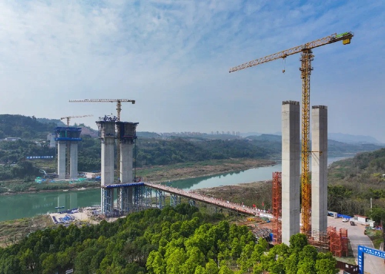 目前,宝山嘉陵江大桥项目主桥主墩已封顶,全面转入上部结构施工,正进行主桥箱梁挂篮悬臂施工。