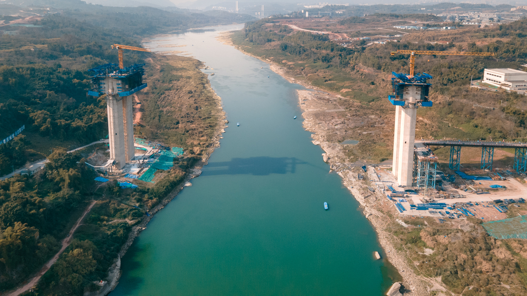 在渝长高速复线连接道工程的控制性工程,黄桷沱长江大桥施工现场,塔吊来回转动运输材料机具,工人们头戴安全帽,身系安全绳,正在开展先导索牵引系统安装、滑移平台钢管支架搭设等高空作业。继主塔封顶后,目前,主桥两侧锚碇散索鞍已安装完成,预计下月将牵引先导索过江,实现两岸顺利“牵手”。