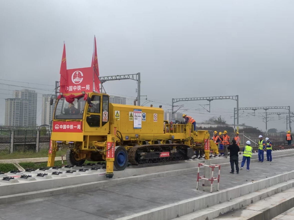 铺轨则采用本邻线长轨铺设机组,该设备配备新型全自动导向装置,可将长钢轨精准导向至相邻待铺线路,实现“一次铺轨、双线成型”,作业效率较传统方式提升近一倍。