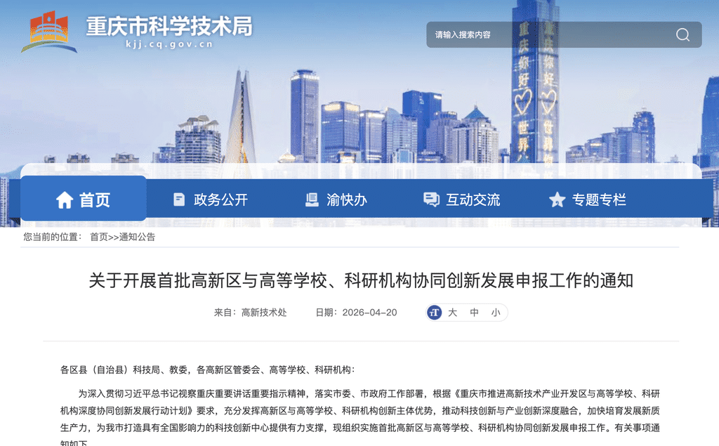 日前,重庆市科学技术局联合重庆市教育委员会发布《关于开展首批高新区与高等学校、科研机构协同创新发展申报工作的通知》,组织实施首批高新区与高等学校、科研机构协同创新发展申报工作。