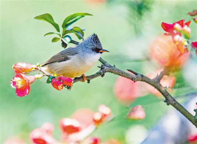 2月22日,南岸区南山街道涂山湖畔,一只黑頦凤鹛在怒放的海棠花枝头停留。记者 罗伟 见习记者 李雨恒 摄/视觉重庆
