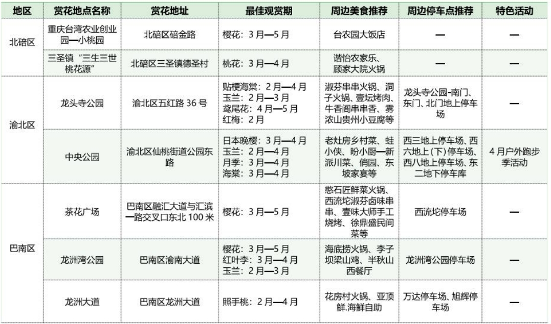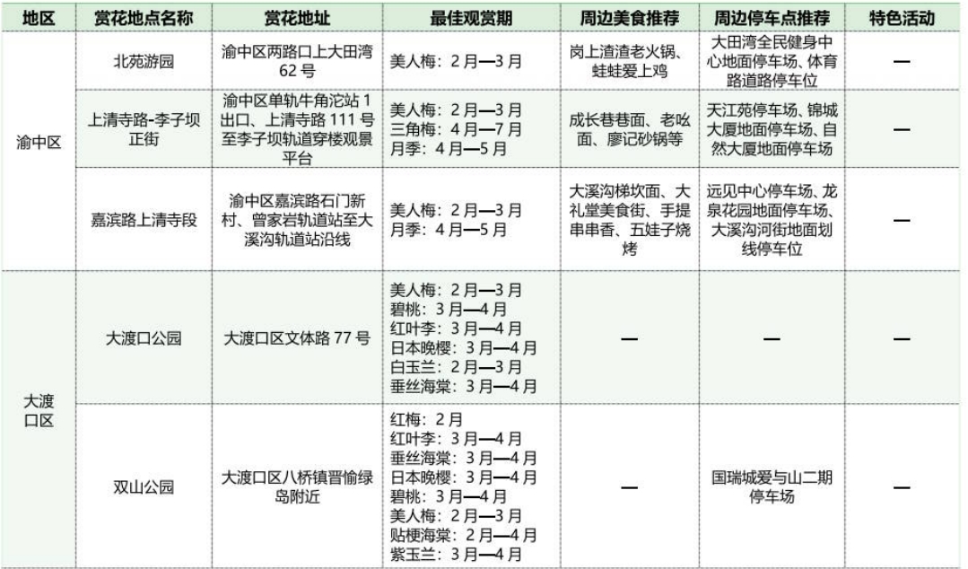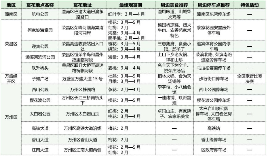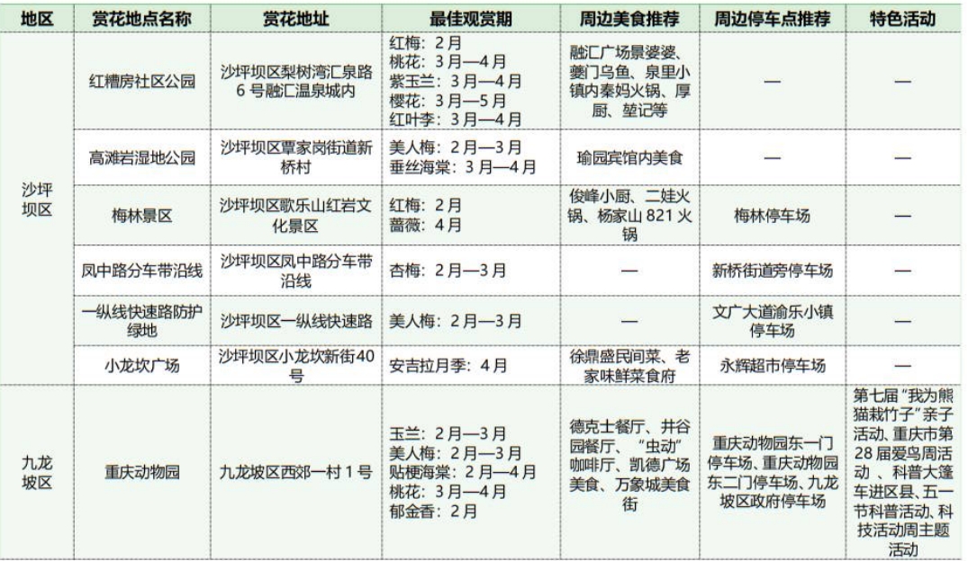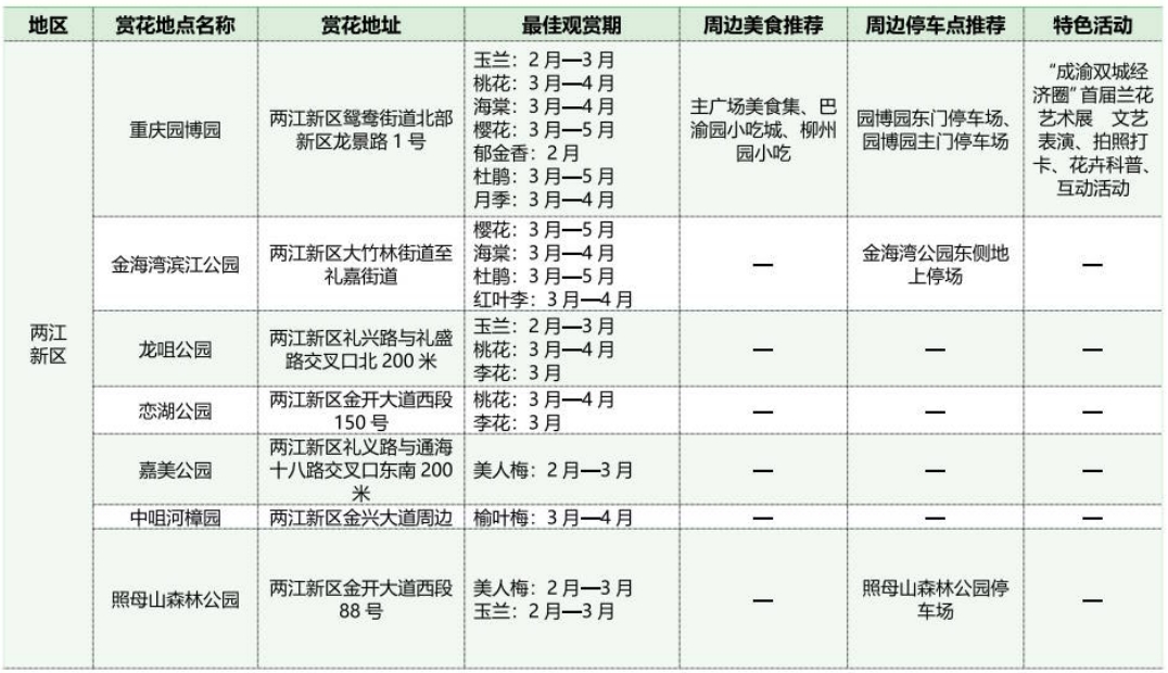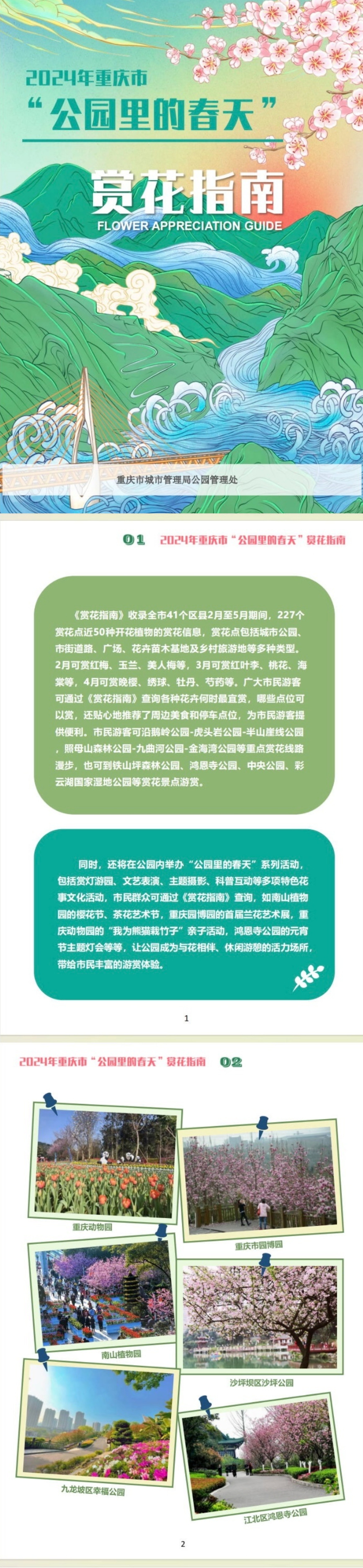 2月23日,市城市管理局发布《2024年重庆市“公园里的春天”赏花指南》(以下简称《赏花指南》),收录全市各区县2月至5月期间,220余个赏花点近50种开花植物的赏花信息,赏花点包括城市公园、市街道路、广场、花卉苗木基地及乡村旅游地等多种类型。