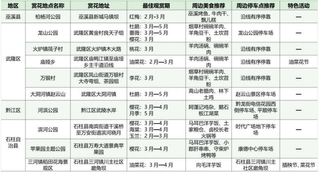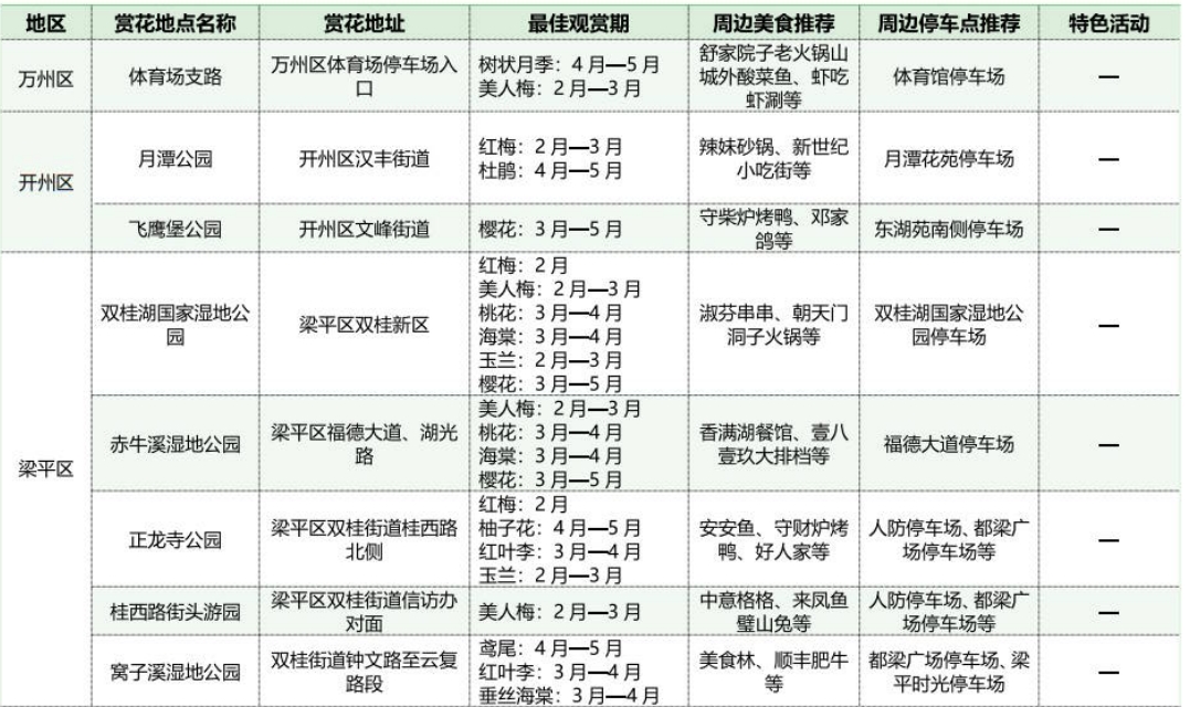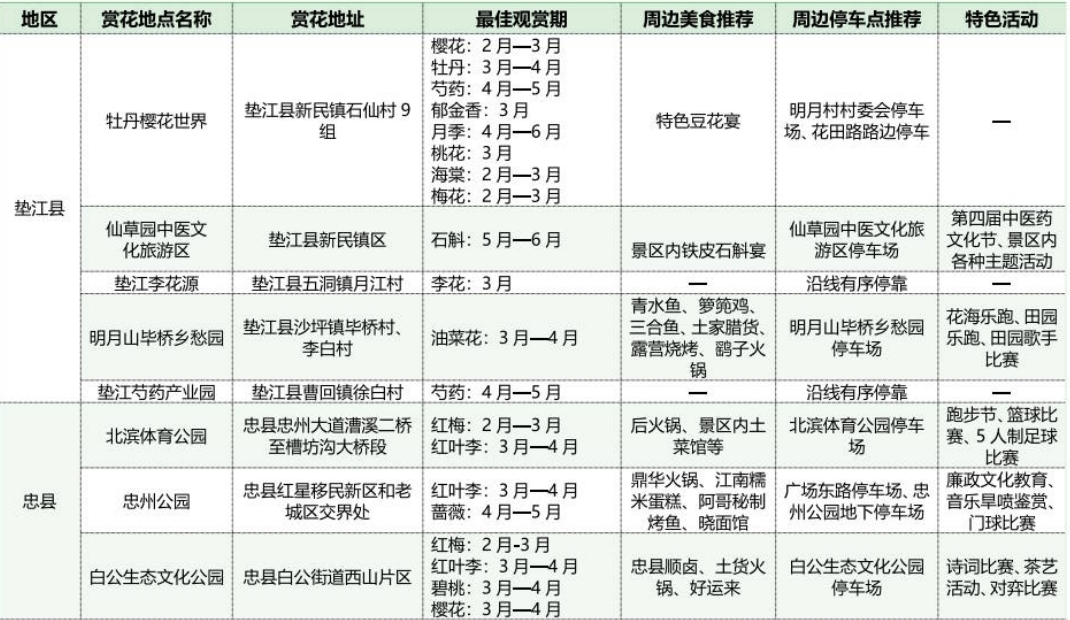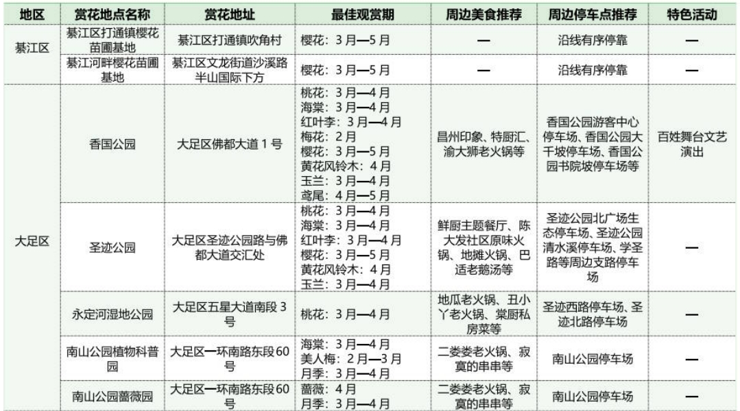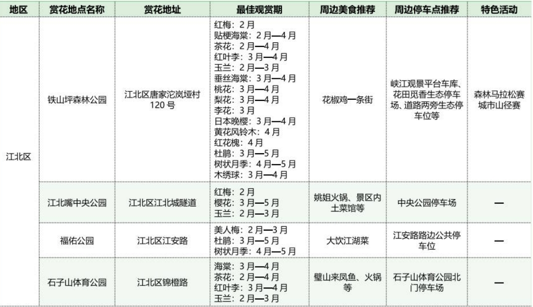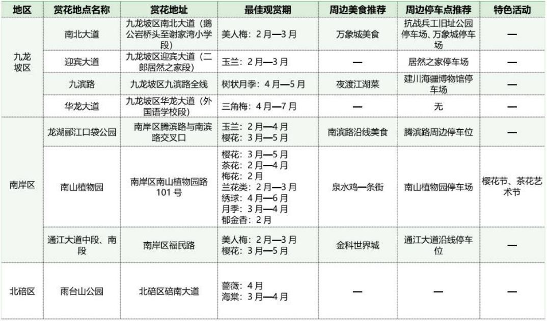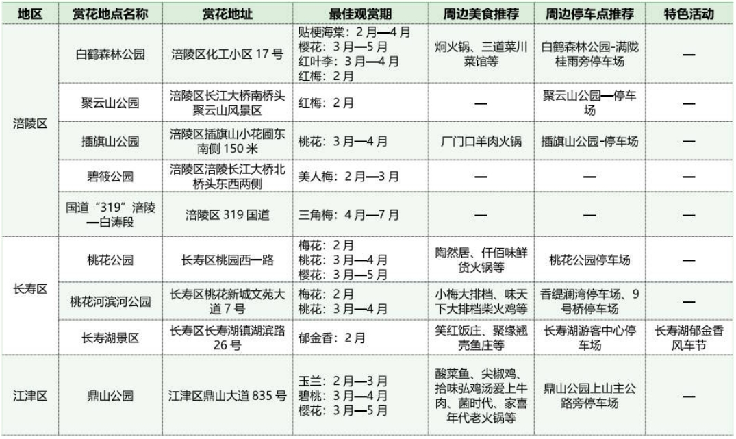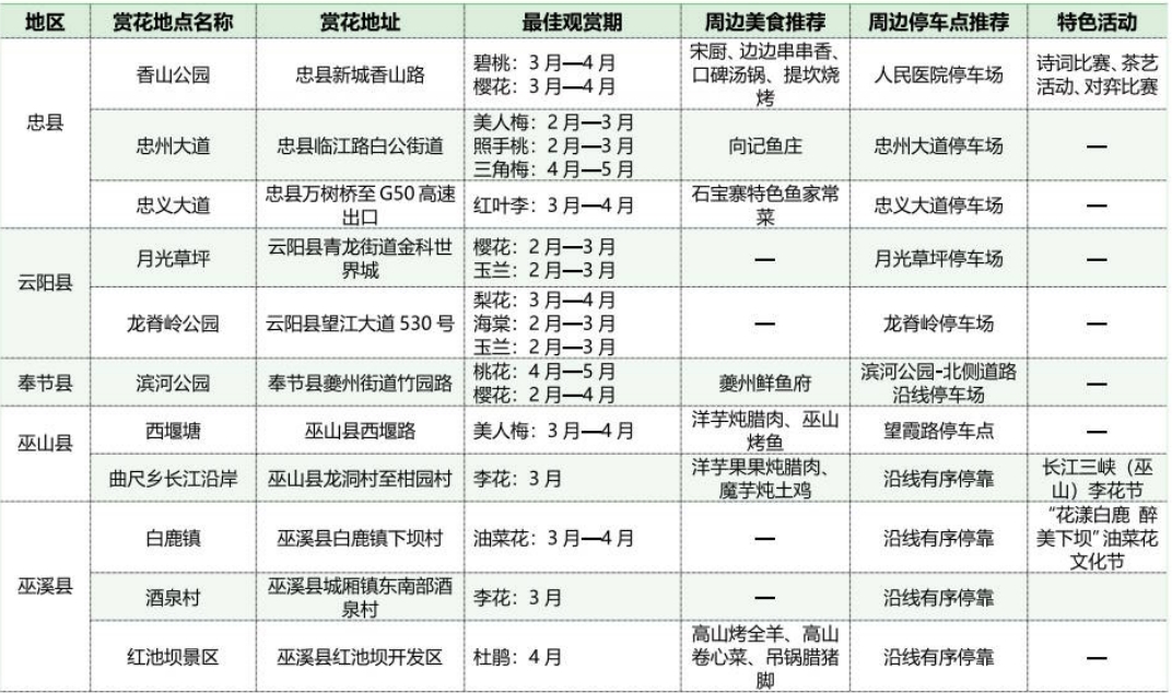 2月23日,市城市管理局发布《2024年重庆市“公园里的春天”赏花指南》(以下简称《赏花指南》),收录全市各区县2月至5月期间,220余个赏花点近50种开花植物的赏花信息,赏花点包括城市公园、市街道路、广场、花卉苗木基地及乡村旅游地等多种类型。