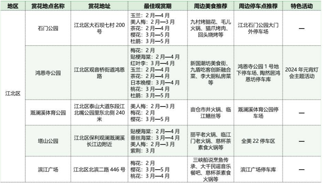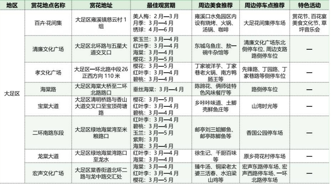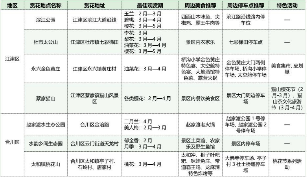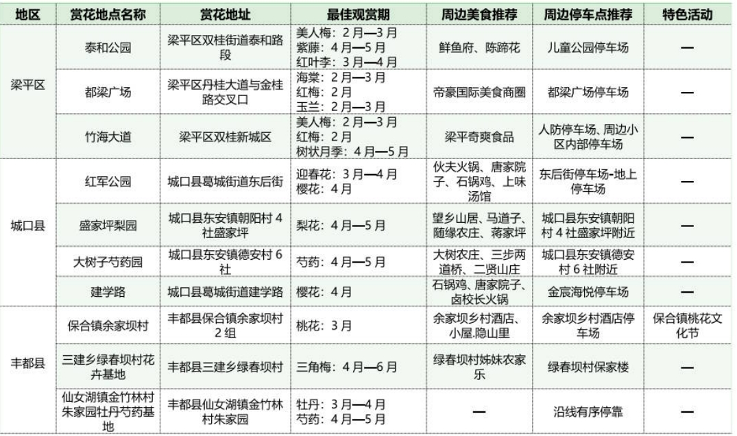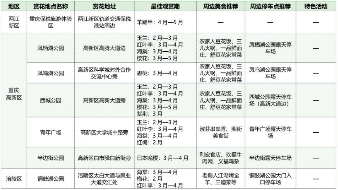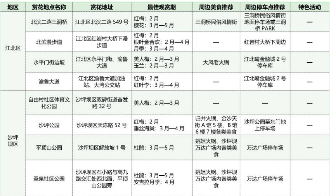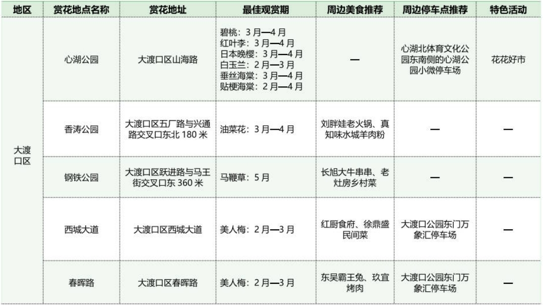 2月23日,市城市管理局发布《2024年重庆市“公园里的春天”赏花指南》(以下简称《赏花指南》),收录全市各区县2月至5月期间,220余个赏花点近50种开花植物的赏花信息,赏花点包括城市公园、市街道路、广场、花卉苗木基地及乡村旅游地等多种类型。