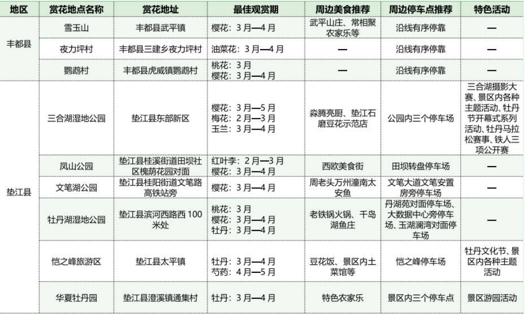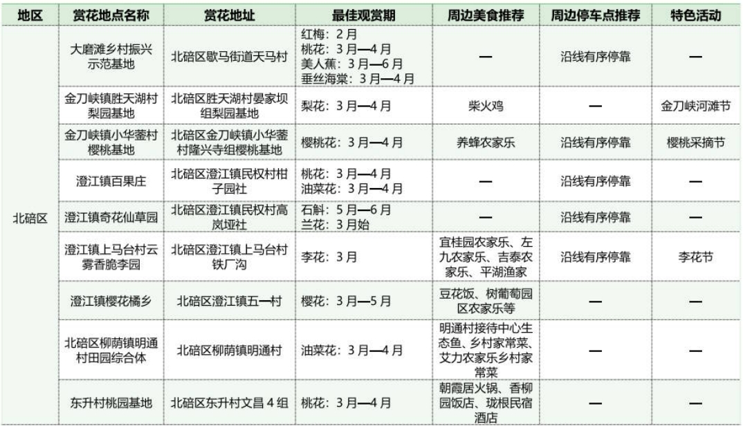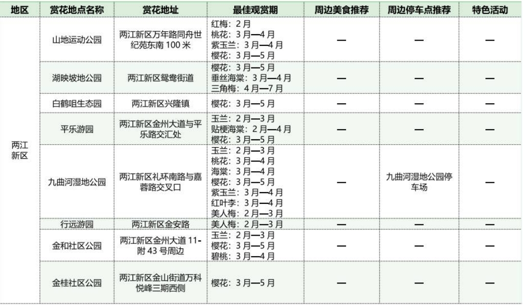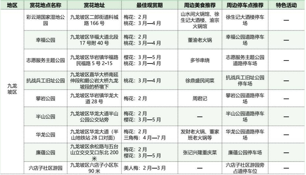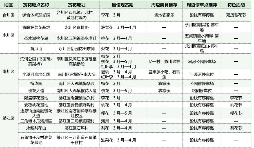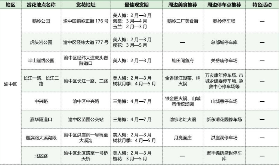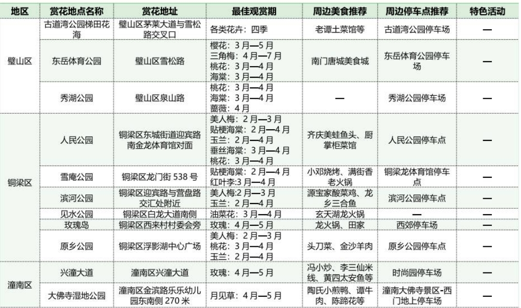 2月23日,市城市管理局发布《2024年重庆市“公园里的春天”赏花指南》(以下简称《赏花指南》),收录全市各区县2月至5月期间,220余个赏花点近50种开花植物的赏花信息,赏花点包括城市公园、市街道路、广场、花卉苗木基地及乡村旅游地等多种类型。