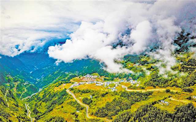 4月8日,重庆市巫溪县红池坝镇茶山村,云雾缭绕,群山环抱下的村落风景如画。