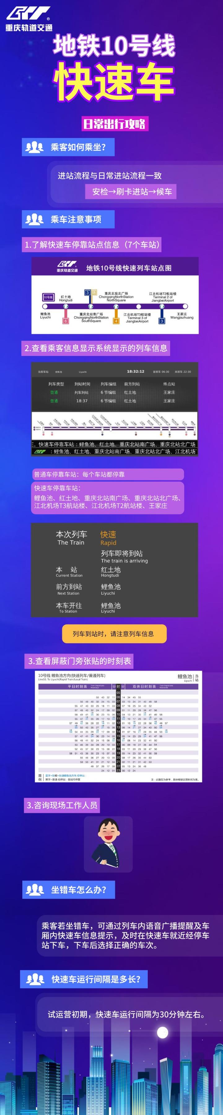 重庆地铁10号线快速车在试运营初期运行间隔为30分钟左右。虽然地铁10号线现有19座车站,普通班次列车站站都停,但是快速车目前只停靠鲤鱼池、红土地、重庆北站南广场、重庆北站北广场、江北机场T3航站楼、江北机场T2航站楼、王家庄7座车站,其他12座车站全部跳过。因此从鲤鱼池站坐到王家庄站全程可节约12分钟左右。