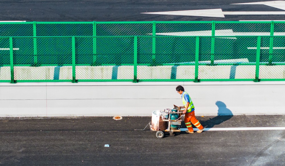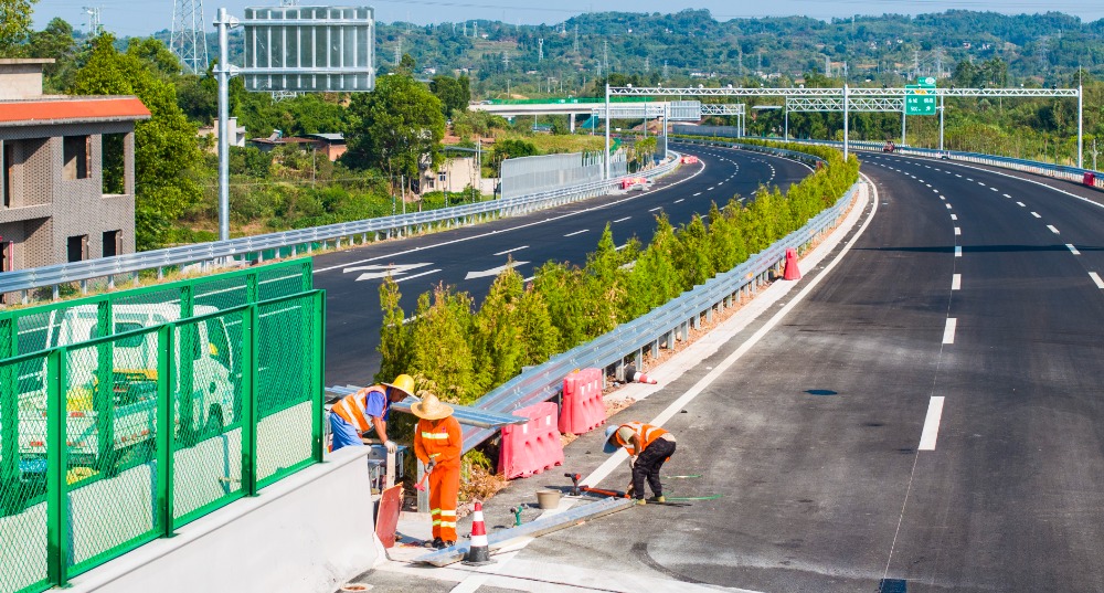 8月23日,铜梁区沙心村,施工人员正在进行地面标线喷涂、机电、交安、绿化等施工。记者 齐岚森 摄