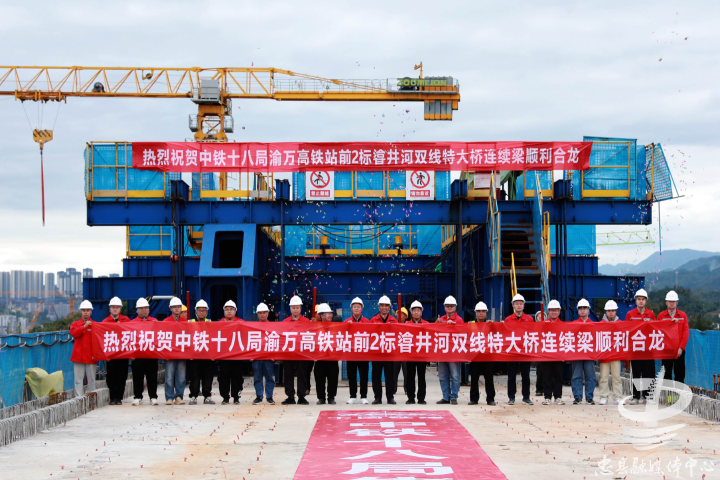 10月24日凌晨5时许,经过7个小时的连续浇筑,中铁十八局渝万高铁站前2标㽏井河双线特大桥全桥合龙,为全线按期通车奠定了坚实基础。